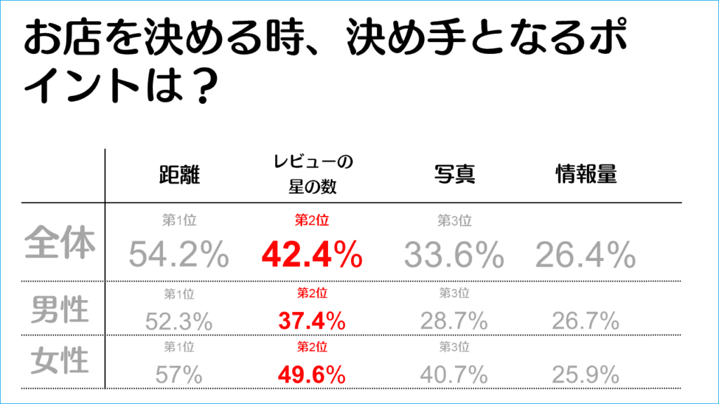 引用元:「地図アプリ利用率調査」 全体の42.4%のユーザーが「レビューの星の数」をお店選びの決め手として挙げているからです。つまり、レビューの星の数を上げるお店の改善努力次第で、お店を選んでもらえる可能性が高くなるのです。