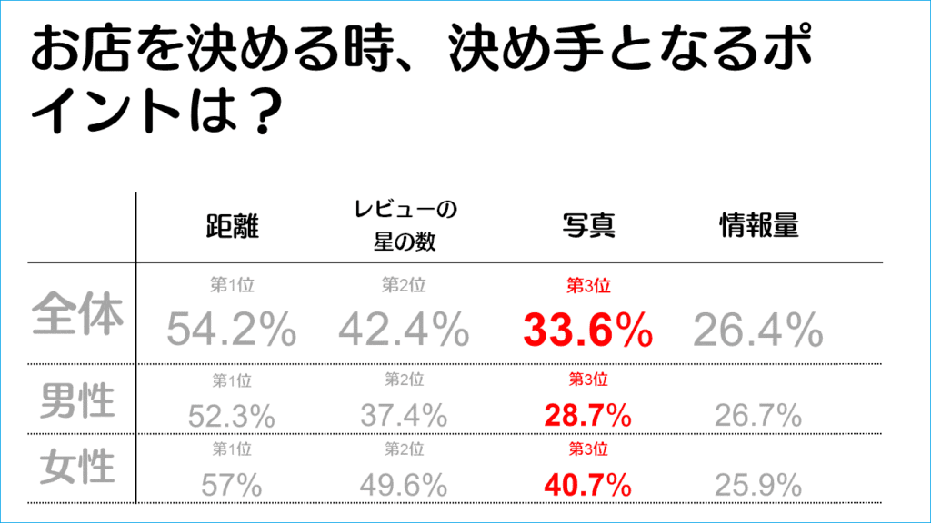 Googleマイビジネス(※)に写真を掲載できることもメリットです。 写真もぱっと見るだけで、すぐにお店のイメージ・メニューや商品のイメージが伝わる情報です。視覚的に、直接訴える写真の情報から「おいしそう」「これは素敵」と思うお店を選ぶのは自然なことです。 そこで、星の数と同様に、お店選びの決め手となる情報として写真情報は多くのユーザーが頼りにしています。 先程と同じ「お店を決める時、決め手となるポイントは?」の調査でも、写真を見てお店を選ぶ人は全体の約3分の1、女性の場合は、40%にも上ります。