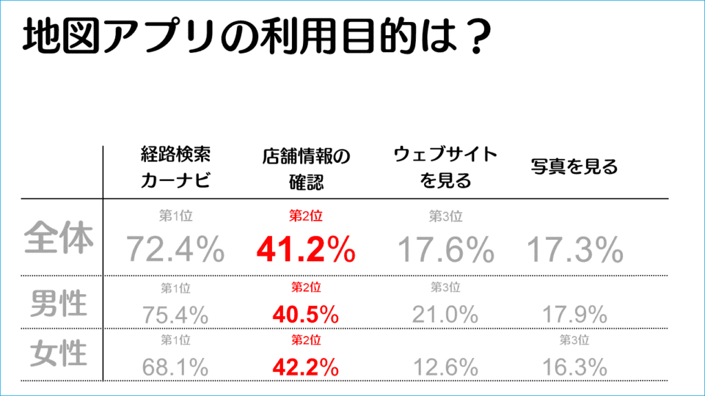 利用者が多いだけでなく、ユーザーが地図アプリで何をするかが集客・新規顧客の獲得には問題になります。 そこで、「地図アプリの利用目的」を調査した結果では、全体の41.2パーセントもの人が「店舗情報の確認」に活用している、との結果が出ています。