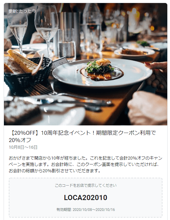 Googleマイビジネス(※)にはキャンペーン・イベントの設定機能がメニューについていて、特別にお店側がカスタマイズをしなくても、投稿機能のページから、簡単な入力だけでイベントを設定し、広く告知できます。 表示も上記の画像のようにきれいに表示されます。ユーザーにとっても「投稿を共有」でSNS・メモ・メールなどで共有することができて便利です。