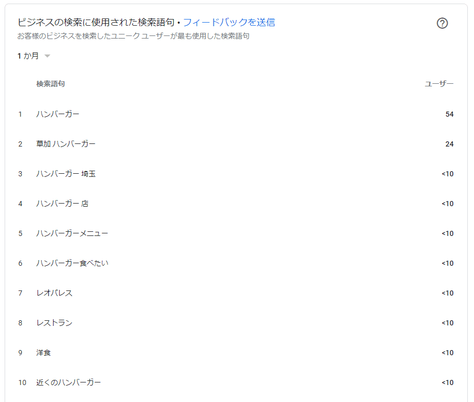 インサイトで表示された流入キーワードを見ると、何がきっかけでビジネスを閲覧することになったのか、また、何に関心を持っている人がビジネスを閲覧することになったのかを知ることができます。流入キーワードには検索数も同時に表示され、順位もわかります。 流入キーワードにより潜在客の意識やトレンドに迫ることができますので、キャンペーンの企画や、店舗業務、内装の改善などに役に立てることができます。