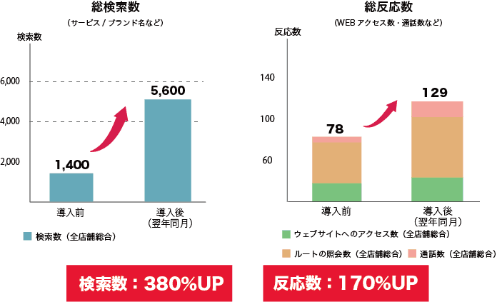 「サービス名」や「ブランド名」で検索した総検索数は、当初1,400件ほどでしたが、MEO対策サービス導入後には5,600件にも増加しています。比率にして380%アップですので、MEO対策にどれほどの効果が出るのかが理解できると思います。 サイトへのアクセス数や店舗へ電話をかけた回数などの「総反応数」は、78件からMEO対策サービス導入後には129件に増加しています。わずか1年のMEO対策で、170%もアップしているのです。 「MEO対策に効果があるのか?」という疑問は、これらの数字を見れば解消されるのではないでしょうか。
