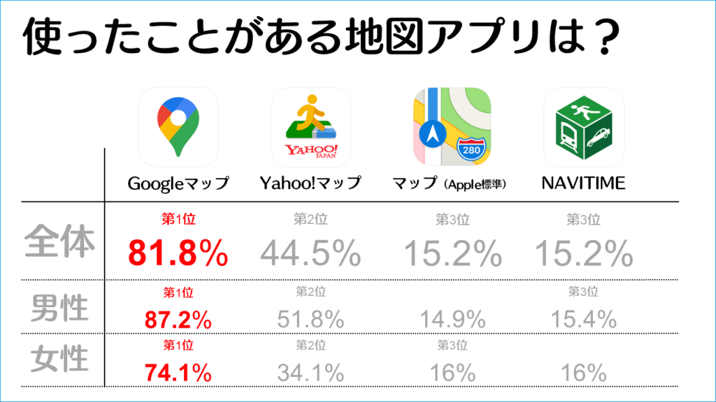 MEO対策で必ず活用したいのが「Googleビジネスプロフィール」です。Googleの公式ツールであり、MEOに有効な機能や仕組みが無料で利用できるからです。 Googleビジネスプロフィールに登録した店舗情報は、GoogleマップやGoogle検索の結果に表示され、ユーザーは地域を含むキーワードで店舗を比較しやすくなります。 写真・カテゴリ・説明文・属性・投稿・メニュー・予約リンクなどのポイントを整えるのが基本の方法です。 さらに、検索表示回数・経路・電話といったデータを定期的に分析し、レビュー返信やQ&Aの更新を回すことで、露出とアクションの両方を底上げできます。 複数拠点がある場合は一括管理で運用負荷を下げ、NAP(名称・住所・電話)の表記統一でサイト側との連携を強化するのも有効です。 2019年1月に実施した弊社の調査「使ったことのある地図アプリは?」では、Googleマップが全体で81.8%という数字で1位という結果でした。2位のYahoo!マップが44.5%ですので、ダントツにトップで利用されているのです。