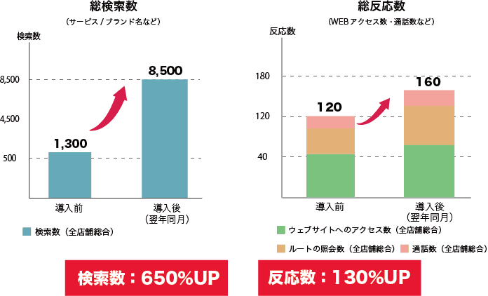 クライアント様の「サービス名」や「ブランド名」で検索した総検索数は、1,300回から1年後(翌年同月)には8,500回と大きな伸びています。比率にして650%もアップしており、MEO対策の大きな効果が証明されている、といえます。 さらに、ウェブサイトへのアクセス数や店舗へ電話をかけた回数などの「総反応数」では、MEO対策前の120件から、160件にも増加しております。比率にして130%アップであり、この数字を見るだけでも来店数や売上アップにつながったことが理解できるのではないでしょうか。