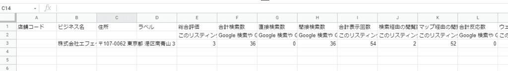 このように、「合計検索数」や「直接検索数」などの「検索に関するインサイト」の分析データをダウンロードすることが可能です。