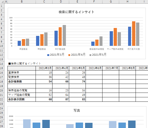 Googleマイビジネス(※)のレポートはCSVファイルでダウンロードされますので、簡単に加工できます。 たとえば、Microsoftのエクセルにデータを貼り付けて、下記のように独自のレポートを簡単に作成できます。