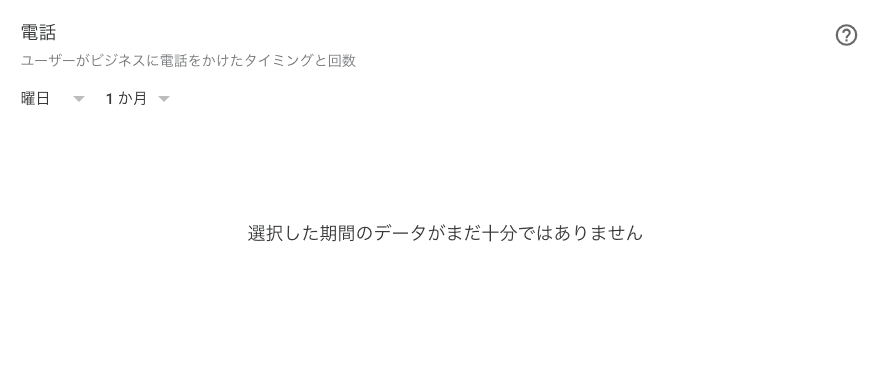 合計通話数グラフでは、 または ごとにユーザーからの通話の傾向を見ることができます。この情報を使用して、ユーザーからの通話数が最も多い曜日や時間帯を知ることができます。 このグラフには、「通話」など、行動を行うためのボタンをユーザーがクリックした合計回数が表示されます。1人のユーザーが1日に3回ビジネスに電話すると、通話回数として3回が記録されます。 今回は電話番号を入力していないため、「選択した期間のデータがまだ十分ではありません」と表示されています。このように店舗の情報が入力されていないとデータが取れないため、気をつけてください。