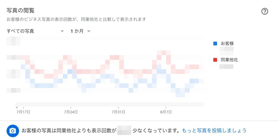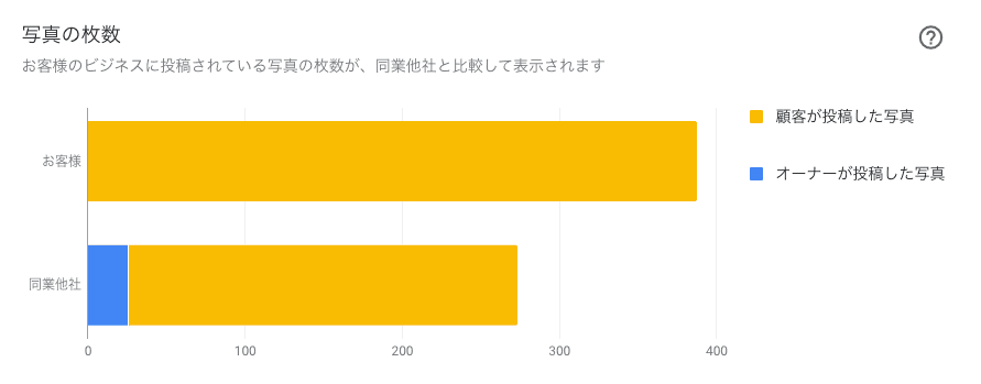 【写真の閲覧】と【写真の枚数】は、ビジネスの写真の表示回数と投稿されている写真の枚数が、同業他社と比較して表示されます。 【写真の閲覧数】・・・お客様に写真が閲覧された回数。 【写真の枚数】・・・ビジネスに投稿された写真の枚数。