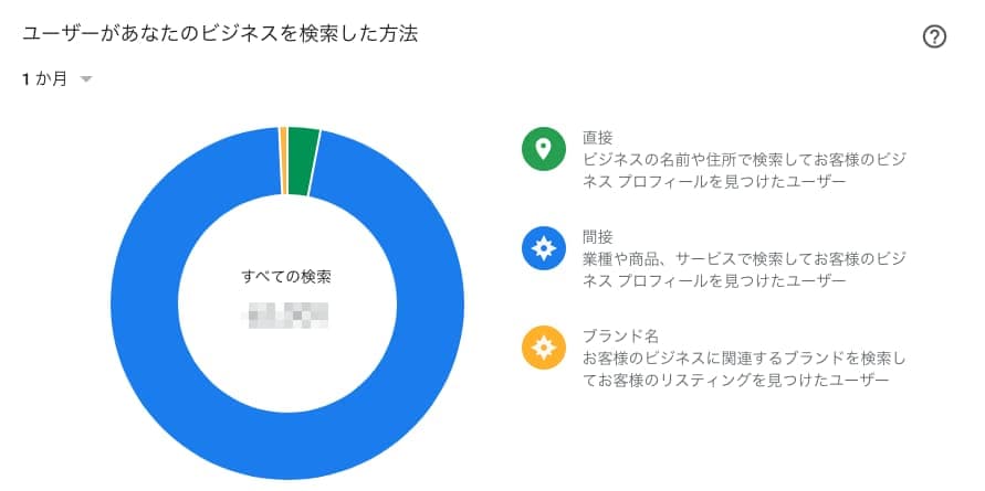 【直接】・・・直接検索数のこと。ビジネスの名前や住所を直接検索したユーザーの数。 【間接】・・・間接検索数のこと。提供している商品やサービス、またそのカテゴリを検索し、ビジネスのリスティングが表示されたユーザーの数。 【ブランド名】・・・ブランド検索数のこと。ビジネスのブランドや、関連のあるブランドを検索したユーザーの数。このカテゴリは、ブランド検索でお客様のリスティングが 1回以上表示された場合にのみ表示されます。 このグラフには、ビジネスを名前またはカテゴリで検索したユーザー数が表示されます。それぞれの検索は個別に計算されるため、ユーザーが間接検索を行った後に直接検索した場合は、検索数は2回としてカウントされます。