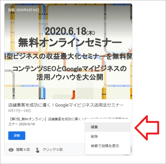 ここではイベントを例に挙げて編集方法をご説明します。 「新規で投稿する方法」を同じように、Googleマイビジネス(※)にログインし、メニューバーの投稿ボタンを押します。 過去の投稿が画面に表示されますので、該当するイベントの投稿の右下にある「…」をクリックします。 クリックすると、下のような画像が表示されます。右下のボタンを押すと、「編集、削除、検索で投稿を表示」との表示が出てきますので「編集」を選択します。