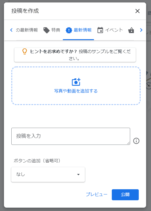 投稿は店舗からの最新のお知らせをユーザーに知ってもらうために行います。そこで、投稿は次にあげる概要のいずれかになります。 ①最新情報 ②イベント ③特典 ④商品 ⑤営業時間の更新 たとえば、入荷情報や新メニューがあれば①、来客にクーポンを配るなら③といった使い方が考えらえます。
