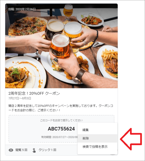 ここではクーポンの削除について例を挙げてご説明します。 Googleマイビジネス(※)へのログイン・左横メニューバーの投稿ボタンを押し、上部に表示されるリボンの中から、「クーポンボタン」をクリックすると、過去のクーポンの一覧が表示されます。 該当するクーポンの投稿の右下にある「…」をクリックすると、下のように画面が表示されます。