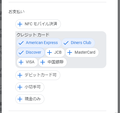 サービスオプションや支払い方法などの、店舗や施設の付帯情報を設定できます。 たとえば、支払い方法の設定であれば、下記の画像のように、可能な手段を選択するだけで表示させられます。