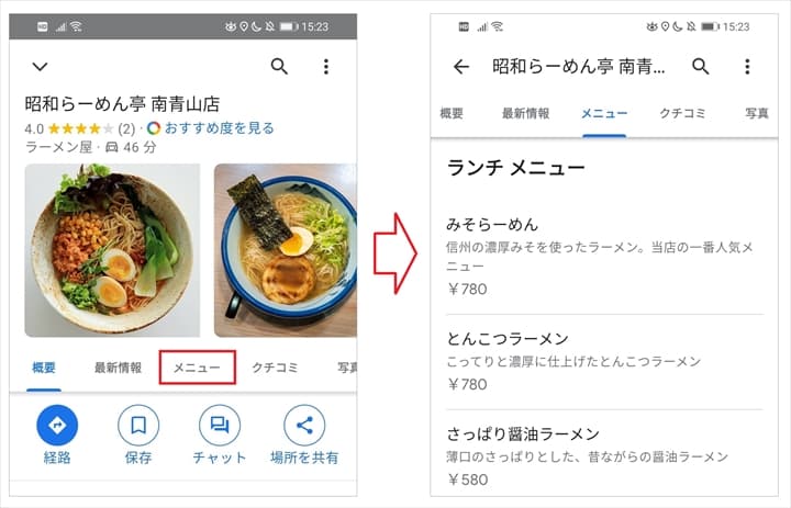 店舗のメニューを設定することで、検索ユーザーは店舗情報からメニューの詳細を確認することができます。 なお、2021年7月現在、メニュー機能はスマートフォンにのみ表示され、パソコンには表示されません。 下記の画像(左側)がGoogleマップで表示された店舗情報ですが、メニューを設定しておくと「メニュー」タブが表示されます。