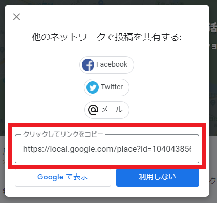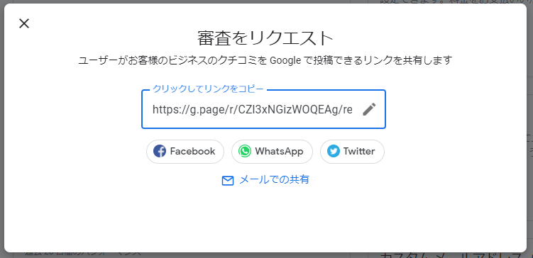 次に、Googleマイビジネス(※)の口コミ投稿の画面をSNS連携する方法です。 Googleマイビジネス(※)のホーム画面にある「クチコミを増やす」の「プロフィールを共有」をクリックすると、下記の画像が表示されます。