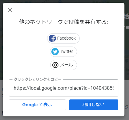 Googleマイビジネス(※)に投稿した時点で、自動的にFacebookやTwitterに投稿することはできないのか、と疑問を持った方もいるのではないでしょうか。 残念ながら、現在では自動的に投稿できる機能はありません。 口コミの短縮URLも同様で、先ほど説明した操作を行ってSNS側に投稿するしかありません。