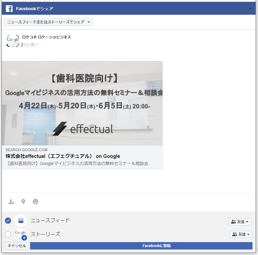 「Facebook」のボタンをクリックすると、下記のようにFacebookの投稿ページが自動で表示されます。下段にある「Facebookに投稿」のボタンをクリックすれば、Facebookに投稿されます。