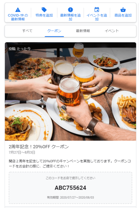 しかし、どれだけGoogleマイビジネス(※)から集客できたかは、特典やクーポン機能をつかうと集客の効果を確実にGoogleマイビジネス(※)との関係で把握することができます。 クーポンは、マイビジネスにログイン後、左横に表示されるメニューバーから「投稿」ボタンを選んで押し、次に表示されるページの上部から「クーポン」タブをクリックすると発行されます。下の画像のように表示されます。