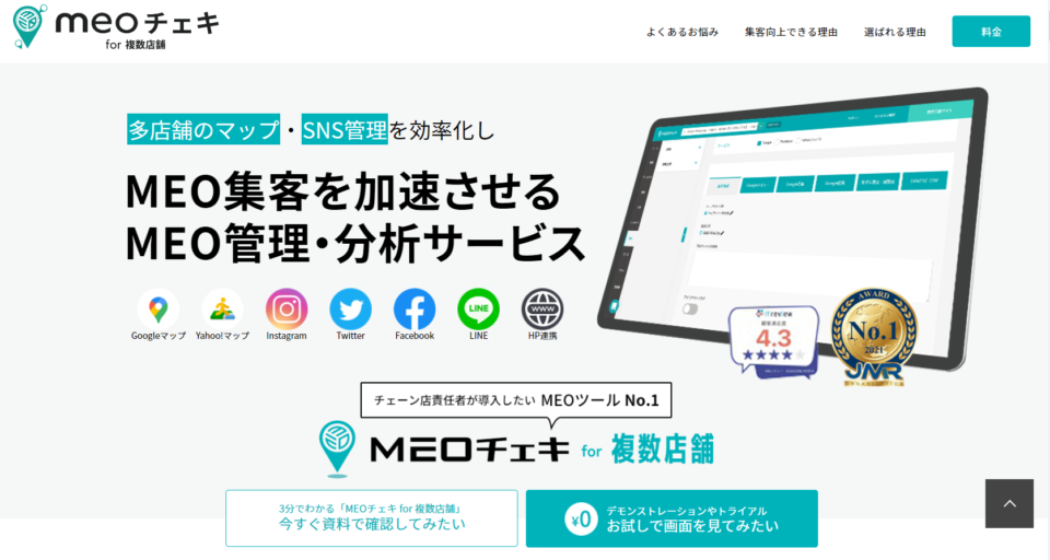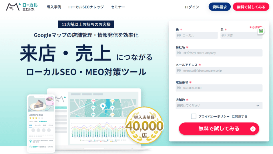 https://local-mieruca.com/ ローカルミエルカはGoogleマップの店舗管理や情報発信を効率化し、集客力や売上向上につなげるMEOツールです。店舗情報や投稿の管理や更新以外にも、マップ順位の計測なども行えます。 さまざまなMEO対策機能として、Googleマップとその他媒体との連携も可能。Instagramとの連携と自動投稿も行えるため、効果的に集客へとつなげられます。
