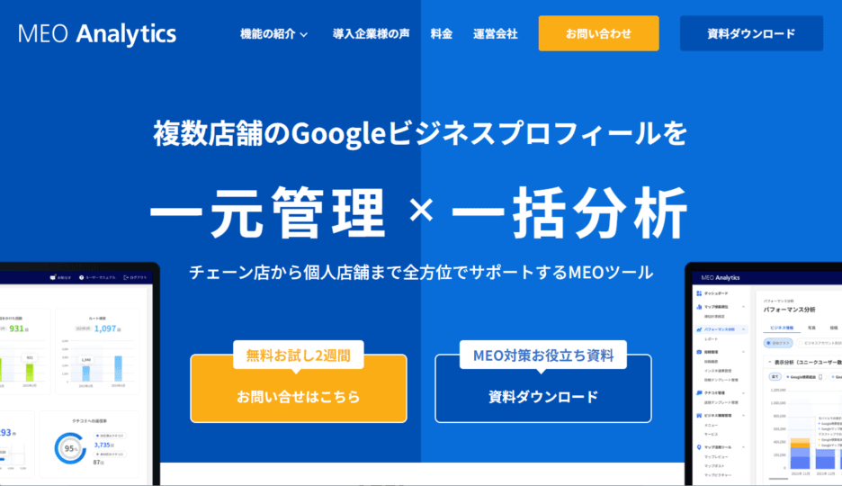 https://meo-analytics.com/ MEOアナリティクスは複数のGoogleビジネスプロフィールを一元管理し、まとめて分析を行えるMEOツールです。各種分析だけでなく、集客力アップにつながる施策なども一括で行えるのが特徴です。 管理画面でInstagramアカウントと紐づけるだけで、Instagramの投稿内容を自動でGoogleビジネスプロフィールへと反映可能。特定のハッシュタグのみを投稿対象とする設定などもできます。