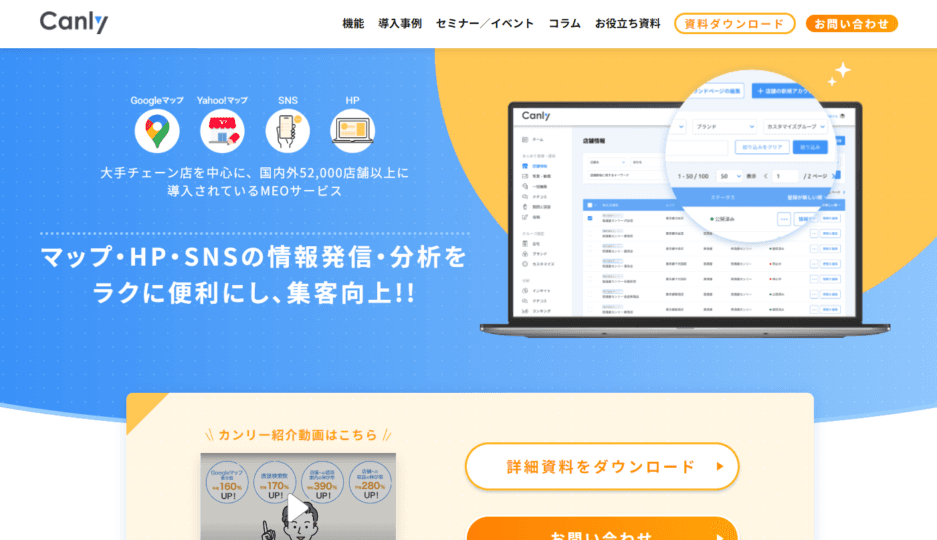 https://jp.can-ly.com/ Canlyは、Googleマップやホームページ(カンリーホームページ)、SNSの情報発信や連携、分析を一括で行えるMEO・SEOツールです。 複数店舗のGoogleビジネスプロフィール情報を一括で管理できるほか、各種SNSやホームページとの連携も可能。Instagramのアカウントの紐付けを行うことで、Instagramの投稿内容をGoogleビジネスプロフィールの投稿へと自動反映できます。