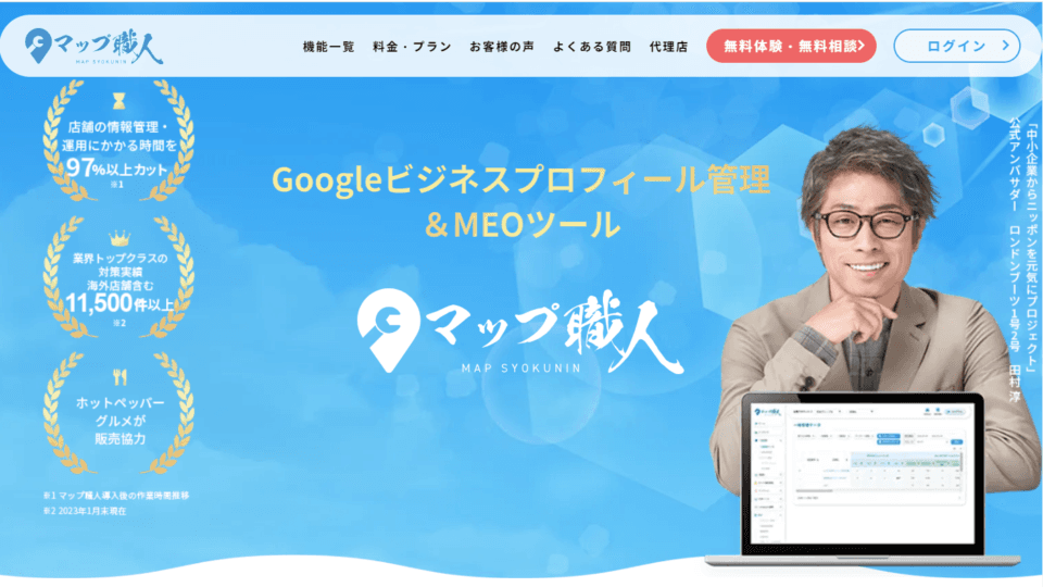 https://mapshokunin.com/ マップ職人は、Googleビジネスプロフィールの管理やMEO対策に必要な分析・施策が行えるMEOツールです。複数の店舗情報をグループや複数名で管理できるのが特徴。 Instagramアカウントとの連携により、Instagramへ投稿した内容を自動でGoogleビジネスプロフィールへと反映させることができます。