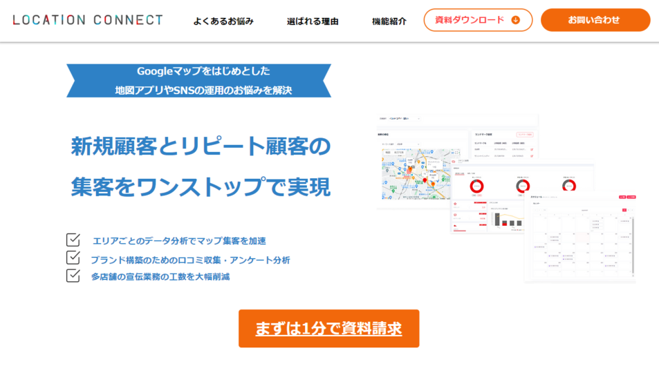 そんな方は弊社の「Location Connect」というサービスについてぜひ知っていただきたいと思います。 「Location Connect」はGoogleマップやSNSの運用を円滑にするための店舗事業者向け複合型クラウドサービスです。 MEO対策やレビュー管理、口コミ獲得の仕組み化、工数削減など、目的やニーズに合わせて、最小の投資で必要なサービスを選択できます。 少しでもご興味がある方は、まずは資料だけでもご覧ください。