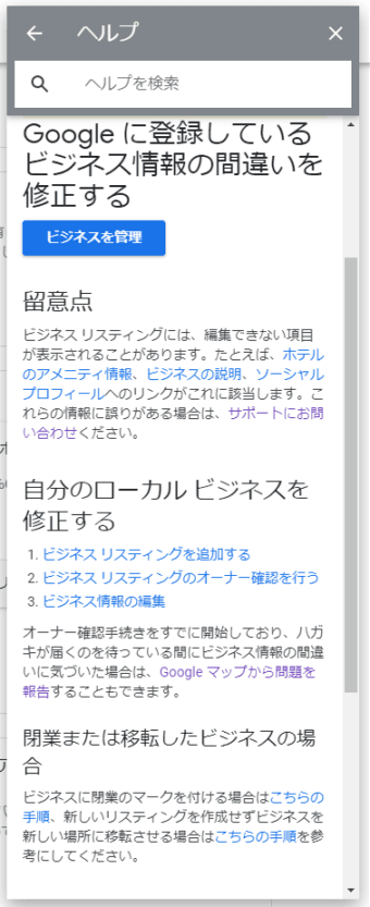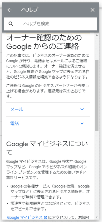 メール・電話と下記の画像で表示されているそれぞれのバーを展開すると、メールの場合の差出人アドレスや、ビジネスの所在地に従った電話番号からオーナー確認が行われることを説明しています。 オーナーに関する情報は、管理画面の「ビジネス情報の編集」から行います。そのため、こうしたケースでのヘルプは、ヘルプセンターを表示させるよりも「サポート」から見られるようになっているほうが便利なのです。