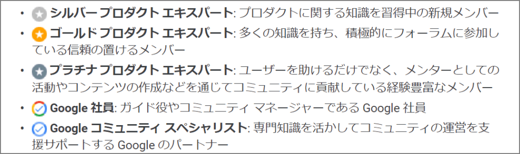 ゴールドプロダクトエキスパート以上の回答者からの回答は、信頼がおけるものと考えてよいでしょう。コミュニティのランク付け評価機能の説明の中ではシルバープロダクトエキスパートは、「新規メンバー」という位置づけであるとされています。 これに、Google社員と、コミュニティスペシャリストというパートナーが回答者に加わります。これらの回答者の回答も、信頼することができます。