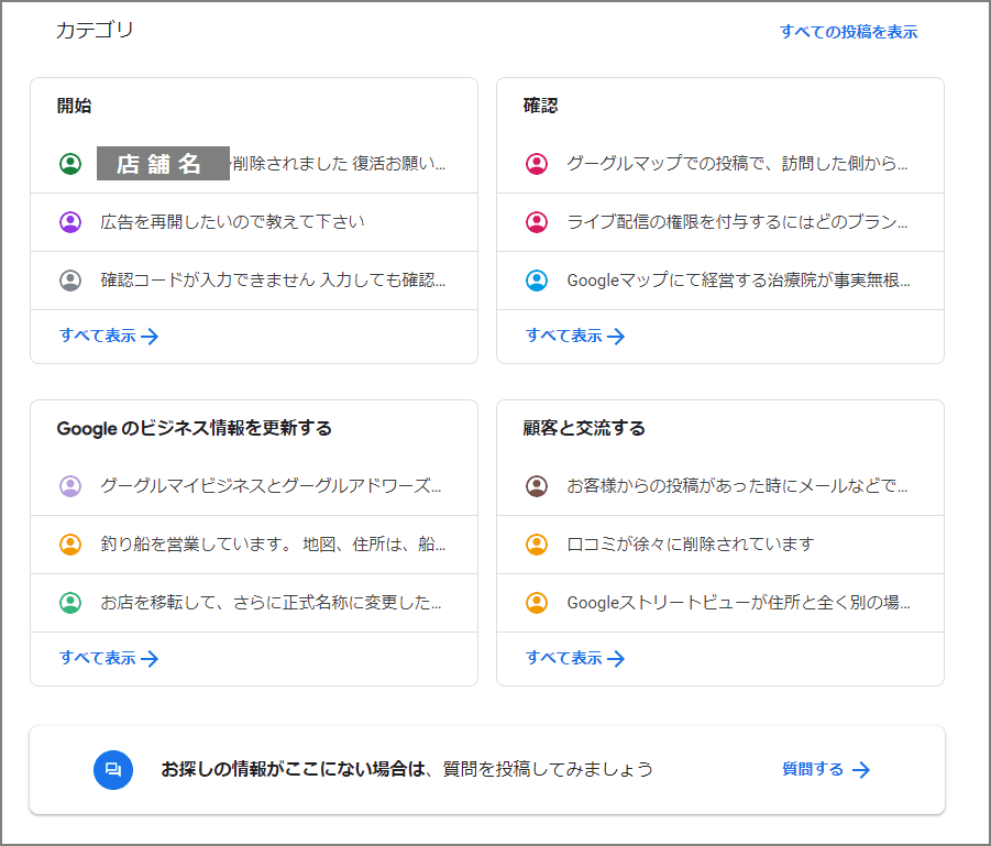 また、双方向で質問ができるため、補足質問や補足説明をすることができます。また、ある条件で生じている問題について、「他の条件ではどうか」など、質問が広がる可能性のある場合にも便利に使えます。 質問と回答のこうした柔軟性がGoogleマイビジネス(※)のヘルプセンターやサポートにはない特徴です。 さらに、過去の質問は、この画像のように記録されているので、質問の当事者だけでなく、幅広いユーザーが閲覧して活用することができます。質問の前にチェックをしておくと、重複の質問を避け、参加者が新しい問題に集中して解決できるようになります。 参加すると有益な結果が得られる公式コミュニティで質問するには、コミュニティへ参加することが前提となります。