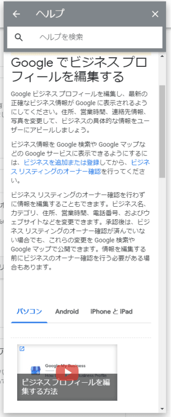 動画の内容を簡単にご説明しますと、マイビジネスにログイン、管理画面を表示、さらに「情報」ボタンを押すと、「ビジネス情報の編集」と表示されます。その右横にある鉛筆ボタンを押して編集を行います。 このように、管理画面を見ながらの作業に関する質問はサポートから知りたい情報がわかると便利です。実際にサポートに表示される情報も、管理画面から利用できる機能とその使い方に関する質問を扱っています。