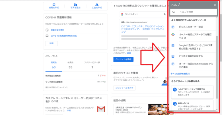 Googleマイビジネス(※)のメンテナンスなどを行っているときに、ヘルプセンターや「お問合せ」を使うよりも便利なのが、「サポート」からの問い合わせです。 マイビジネスにログインして管理画面を表示、左横のメニューバーから、「サポート」ボタンを押すと下記の画面のように、右横に「ヘルプ」メニューが表示されます。