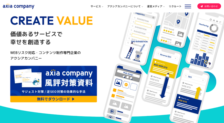 株式会社アクシアカンパニーは、風評被害対策を専門とする企業です。サジェスト対策だけでなく、逆SEO対策やMEO対策といった幅広い手法を使いながら企業や個人の評判管理を行っています。