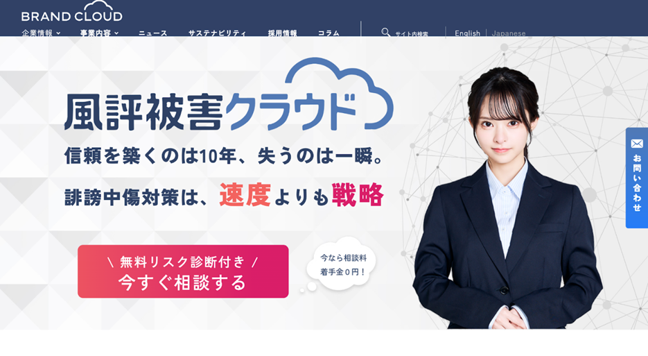 株式会社ブランドクラウドは、風評被害対策を専門とする企業です。20年以上にわたる豊富な経験を活かした効果的な施策が高く評価されており、特にコンサルティングの対応力やアフターフォローの満足度の高さが強みです。また、上場企業の風評被害対策を手掛けた実績もあります。