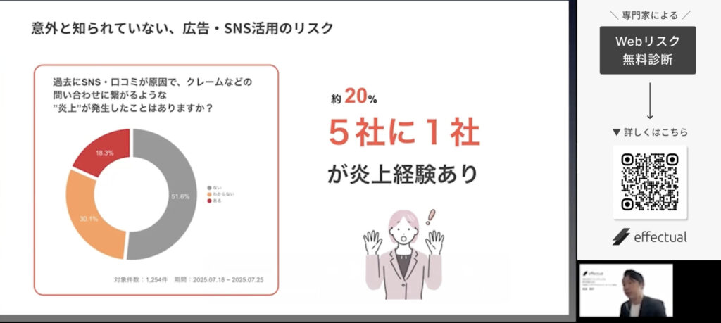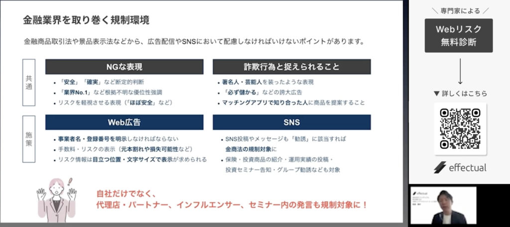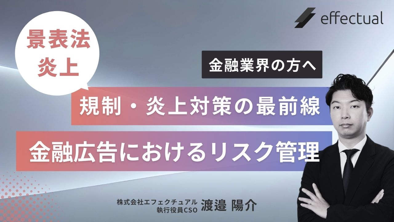 本オンデマンド講座では、エフェクチュアルが最新の行政処分事例・SNS炎上事例をもとに、金融広告における“やってはいけない表現”と、すぐに実践できるリスク管理のポイントをわかりやすく解説します。